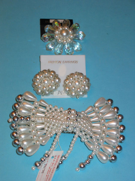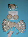 Večernji set vrlo lijepog dizajna. Set sadrži: broš, kopču za kosu i naušnice od umjetnih bisera.