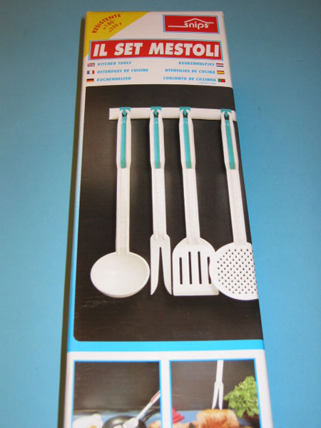 Set od 6 komada kuhinjskih pomagala od specijalne plastike za teflonsko posuđe + vješalica za zid.